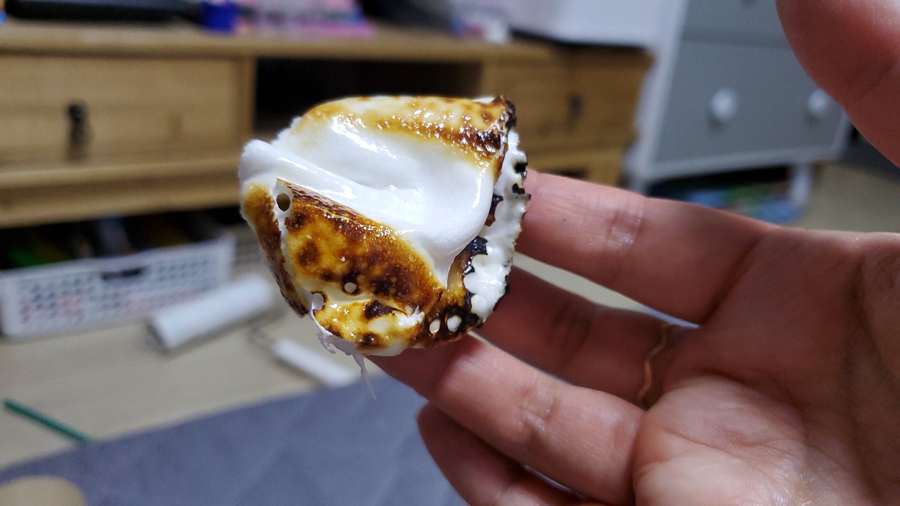 마시멜로 도착하자마자 곧바로 구워봤다. 거참 냄새가 달콤하지만 내가 좋아하는 달콤한 냄새가 아니라서 당황했다.