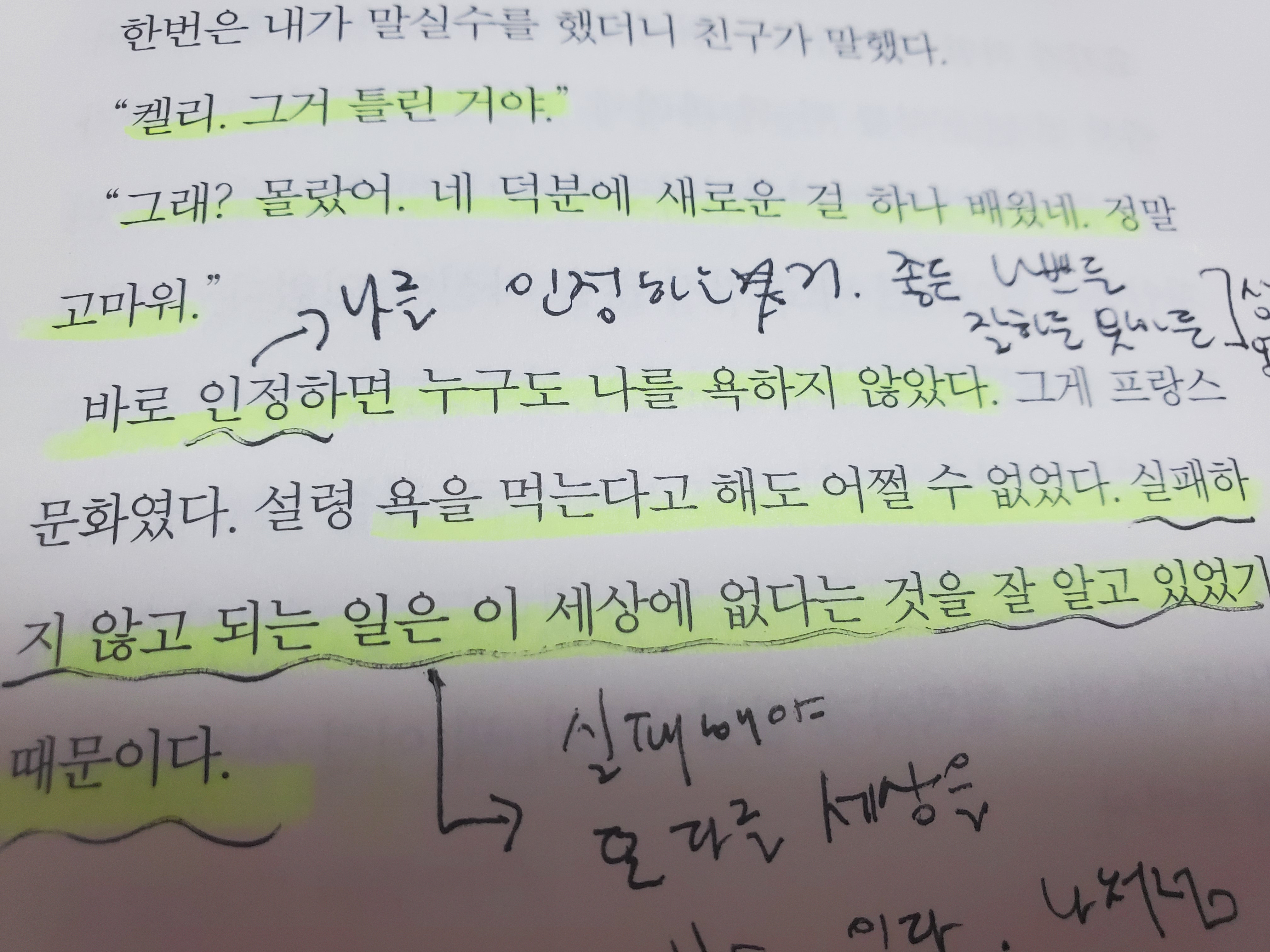 실패한 인생을 생각하니 참 많았다. 그 많은 실패 속에서 나는 나의 실패를 인정했는가? 아니었다. 숨기기 바빴고 다른 사람 그늘에 안주하려 했다. 똥이 무서워 피하는 격이 되고 말았던 지난 과거. 그러나 켈리의 말처럼 작은 것에부터 큰 것에 이르기까지 실패를 인정해야만 성장이 가능하다. 하지만 나는 실패를 인정하지 않고 숨기며 살았다. 실패의 과정을 여러 번 겪고 나니 더는 숨기고 싶지 않았다. 아니 숨길 수 없는 지경에 이르렀다. 실패를 인정하지 않고 있으니 또 다른 실패와 패배자가 되어 한 없이 나락으로 떨어졌다. 더는 내려갈 바닥도 없었고 차고 넘치는 실패를 숨길 곳이 없었다. 결국, 실패를 인정하고 하나하나 이야기보따리를 풀어내고 있다. 풀어내는 모든 것들이 수치스럽고 불편한 이야기들이지만 사람이니깐 누구나 일어날 법한 일들이라고 스스로 다독이고 인정했다. 그 후로 비로소 나를 들여다보았고 지금은 나를 숨기지 않고 인정하게 되었다. 이제는 실패하고 싶지 않다. 실패 속에 분명히 일어설 수 있는 힘이 숨겨져 있을 것이다.